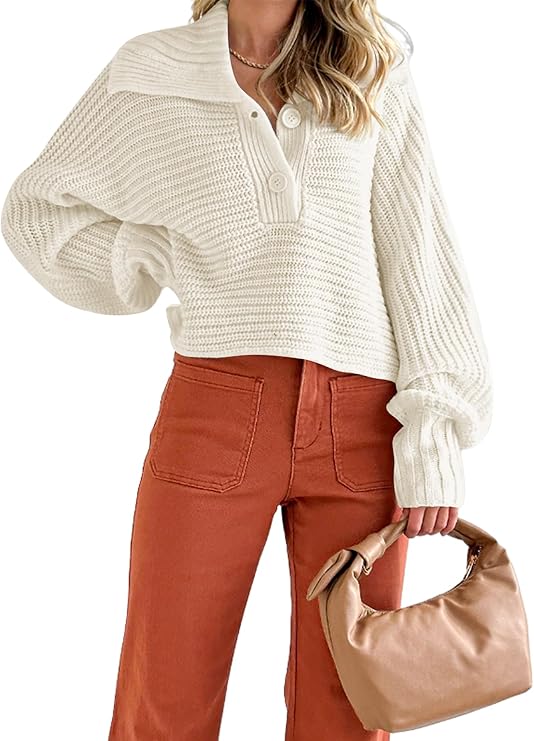 Womens Sweaters Cropped Lapel Collar V Neck Chunky Knit Casual Slouchy Loose Jumper Tops