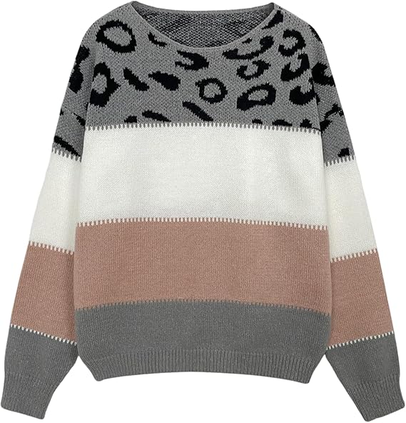 Women's Oversized Cute Color Block Leopard Sweaters Fall 2024 Causal Cozy Ribbed Knit Crewneck Pullover Sweater